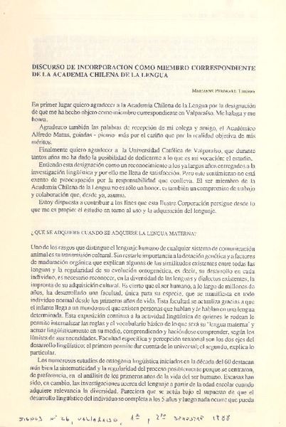 Discurso de incorporación como miembro correspondiente de la academia chilena de la lengua [artículo] Marianne Peronard Thierry.