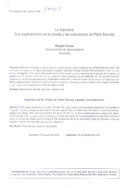 La impureza: sus implicaciones en la poesía y las colecciones de Pablo Neruda [artículo]Sergio Holas.