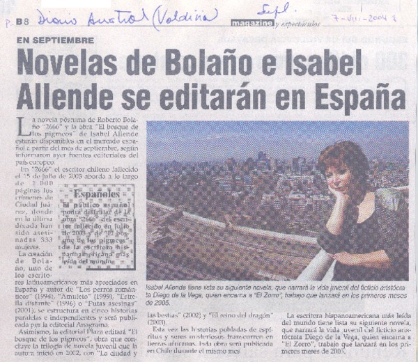 Novelas de Bolaño e Isabel Allende se editarán en España [artículo].
