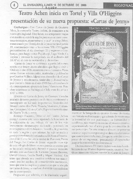 Teatro Achen inicia en Tortel y Villa O´Higgins presentación de su nueva propuesta: "Cartas de Jenny" [artículo].