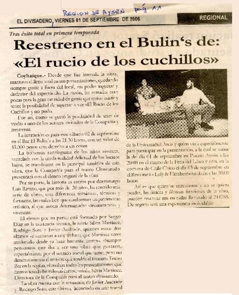 Compañía para el Teatro Clusurado estrena El Rucio de los cuchillos [artículo].