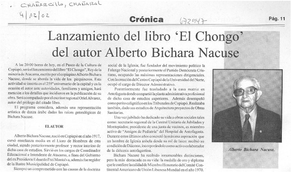 Lanzamiento del libro "El chongo" del autor Alberto Bichara Nacuse. [artículo]