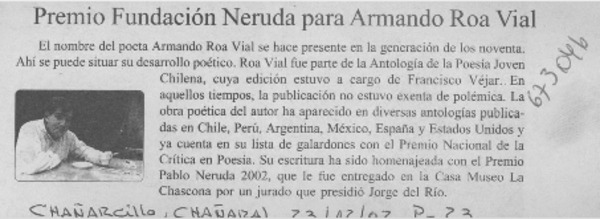 Premio Fundación Neruda para Armando Roa Vial. [artículo]