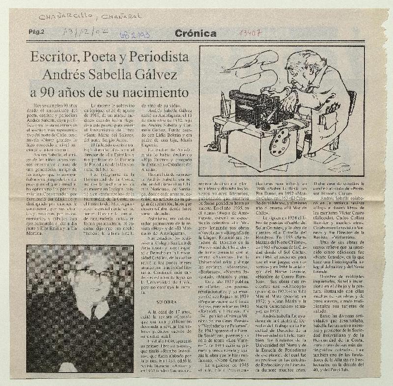 Escritor, poeta y periodista Andrés Sabella Gálvez a 90 años de su nacimiento. [artículo]
