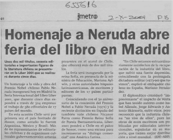 Homenaje a Neruda abre feria del libro en Madrid. [artículo]