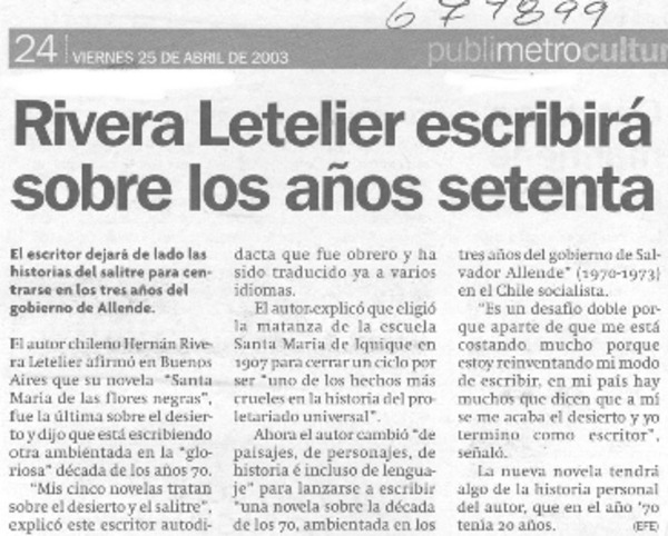 Rivera Letelier escribirá sobre los años setenta. [artículo]