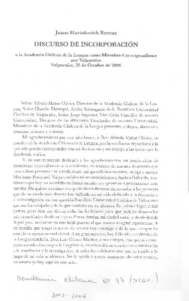 Discurso de incorporación [artículo]Juana Marinkovich Ravena.