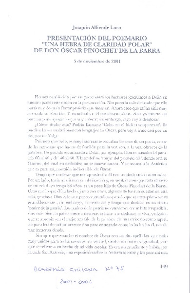 Presentación del poemario Una hebra de claridad polar [artículo] Joaquín Alliende Luco.