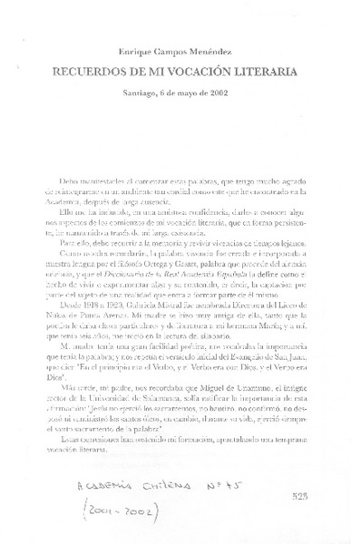 Recuerdos de mi vocación literaria [artículo] Enrique Campos Menéndez.