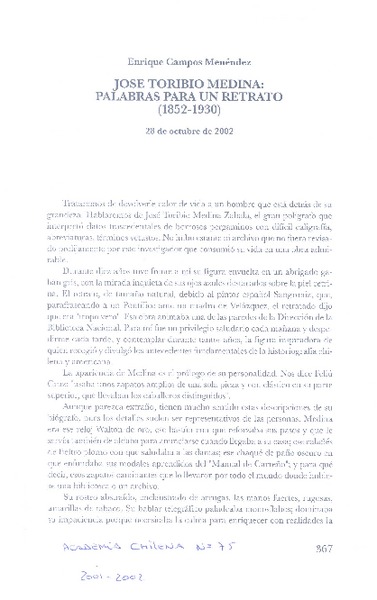 José Toribio Medina. Palabras para un retrato [artículo] Enrique Campos Menéndez.