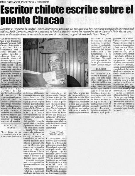Escritor chilote escribe sobre el puente Chacao. [artículo]