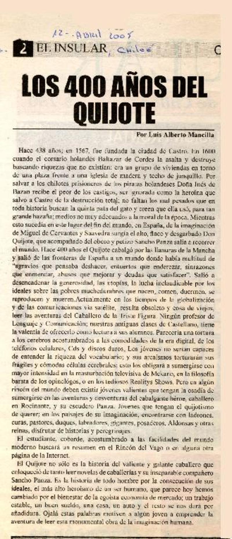Los 400 años del Quijote [artículo] Luis Alberto Mancilla.