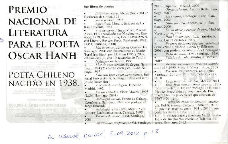 Premio Nacional de Literatura para el poeta Oscar Hanh (sic). Poeta nacido en 1938. [artículo]