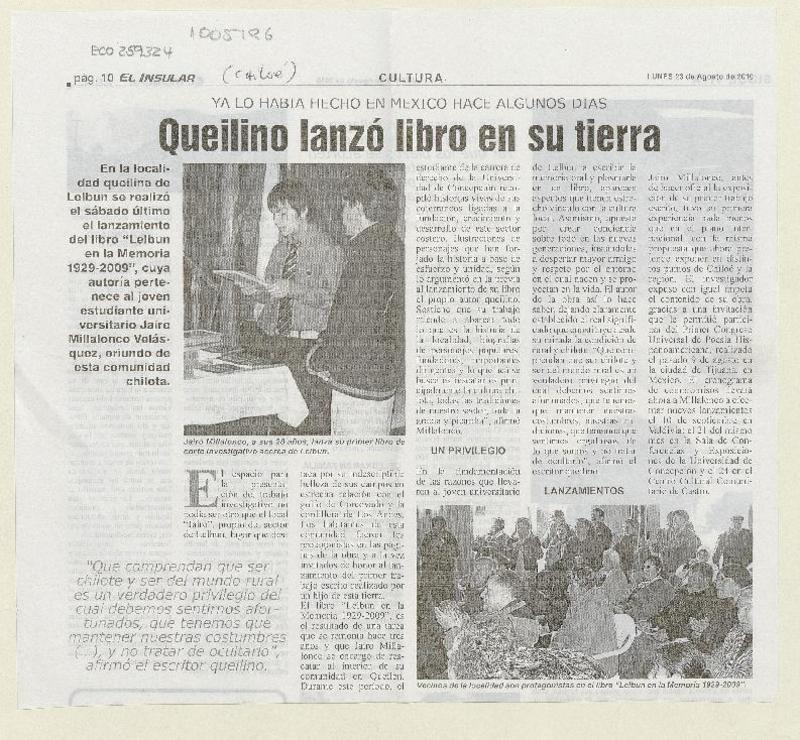 Queilenino lanzó libro en su tierra [artículo].