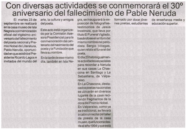 Con diversas actividades se conmemorará el 30° aniversario del fallecimiento de Pablo Neruda [artículo]