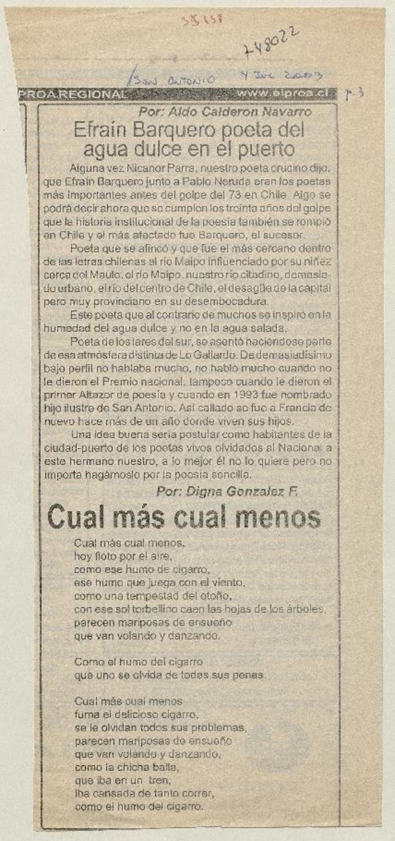 Efraín Barquero poeta del agua dulce en el puerto [artículo] Aldo Calderón Navarro.