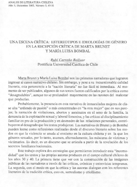 Una escena crítica: estereotipos e ideologías de género en la recepción crítica de Marta Brunet y María Luisa Bombal. [artículo]