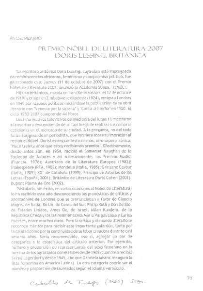 Premio Nobel de Literatura 2007 Doris Lessing, británica [artículo] : Angel Pizarro.