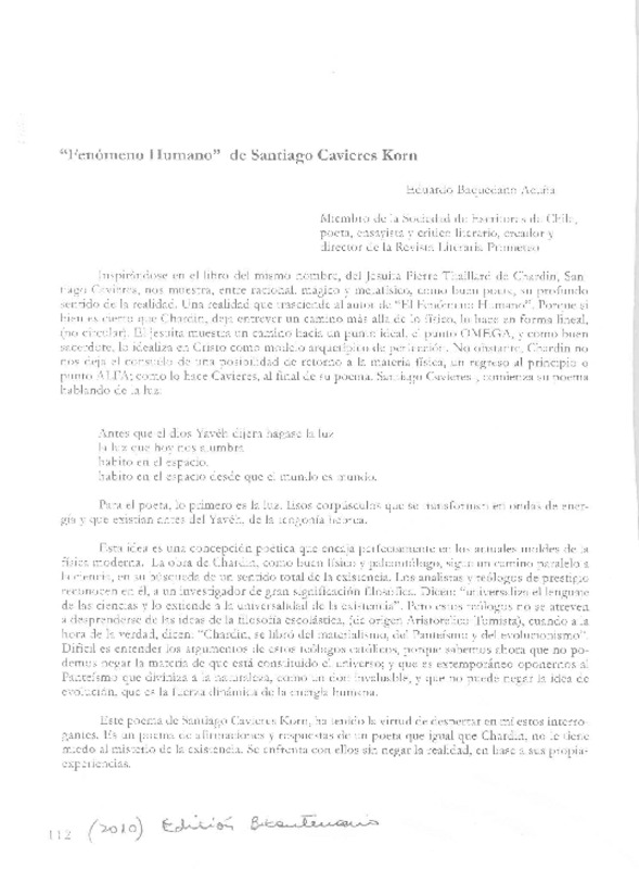 "Fenómeno humano" de Santiago Cavieres Korn [artículo] Eduardo Baquedano Acuña.