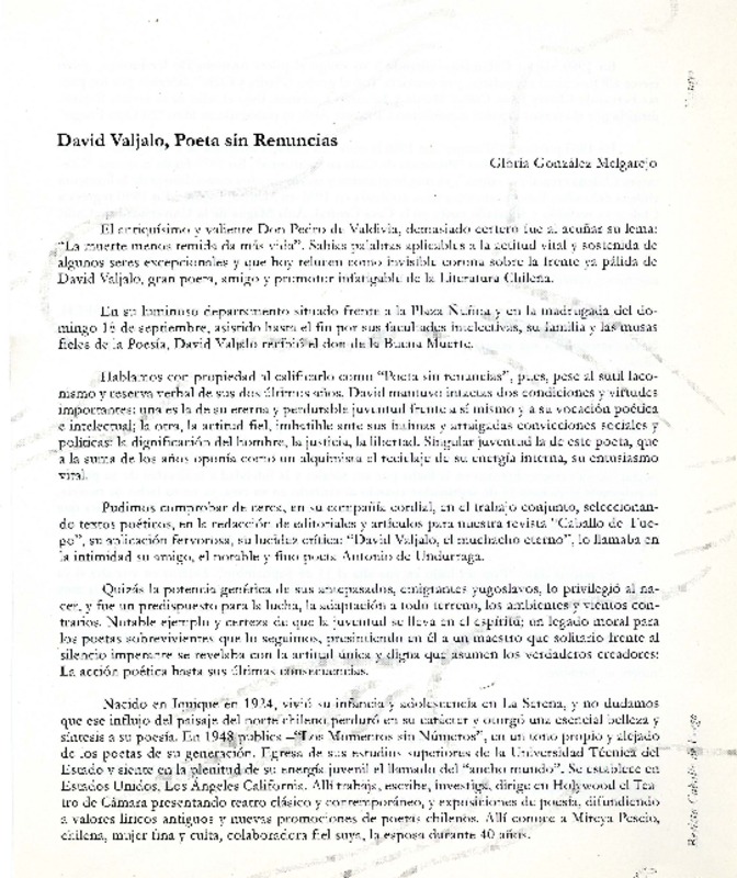 David Valjalo, poeeta sin renuncias [artículo] Gloria González Melgarejo.