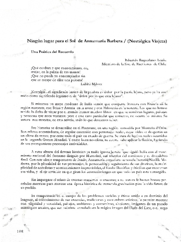 Ningún lugar para el sol de Annamaría Barbera [artículo] Eduardo Baquedano Acuña.