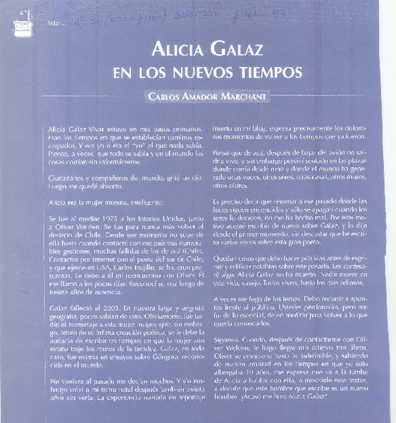 Alicia Galaz en los nuevos tiempos [artículo] Carlos Amador Marchant.