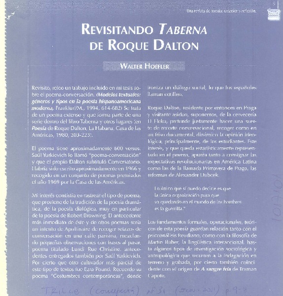 Revisitando Taberna de Roque Dalton [artículo] Walter Hoefler.