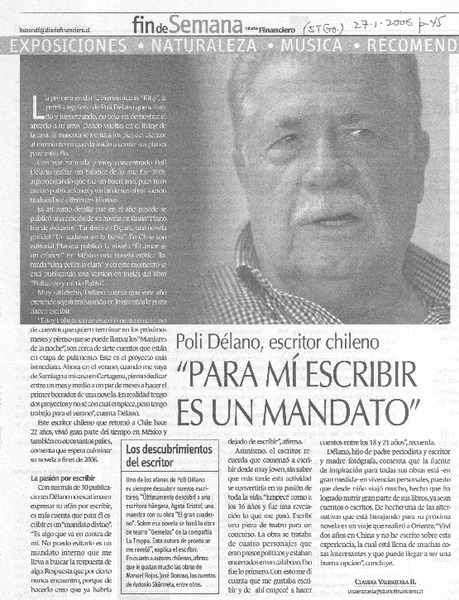 "Para mí escribir es un mandato" [artículo] Claudia Valenzuela R.