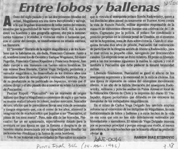 Entre lobos y ballenas [artículo] Ramón Díaz Eterovic.
