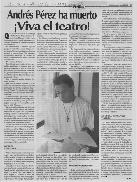 Andrés Pérez ha muerto ¡Viva el teatro! [artículo] L.P.I.