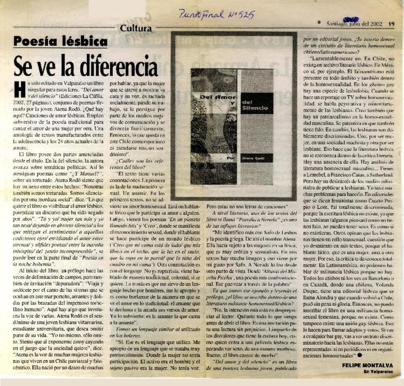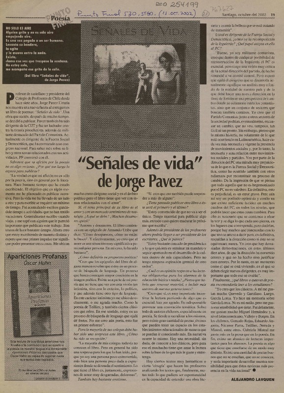 "Señales de vida" [artículo] Alejandro Lavquen.