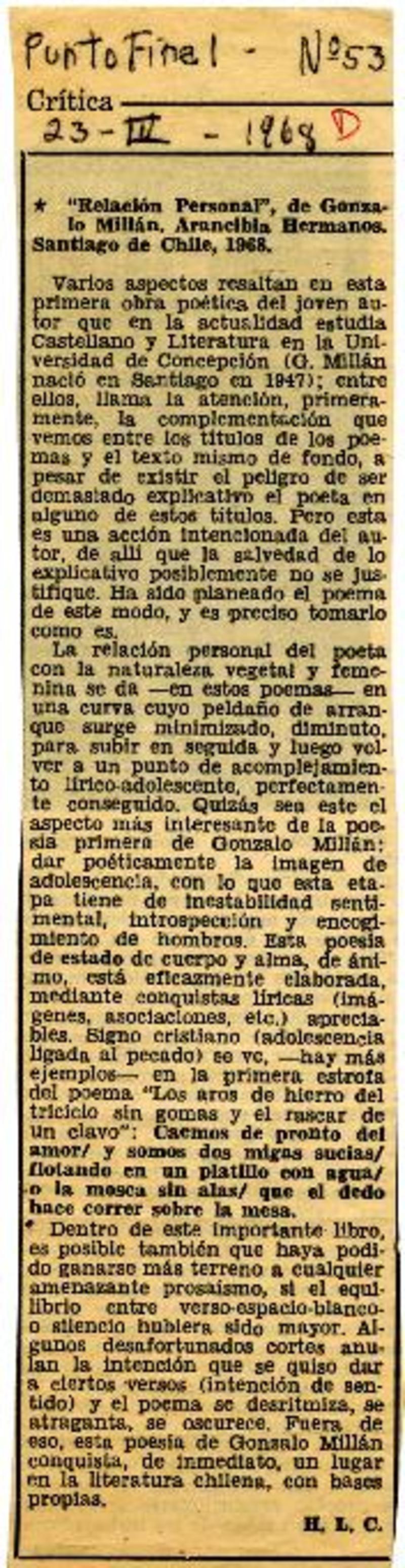 Autores chilenos - Millán, Gonzalo - Relación personal