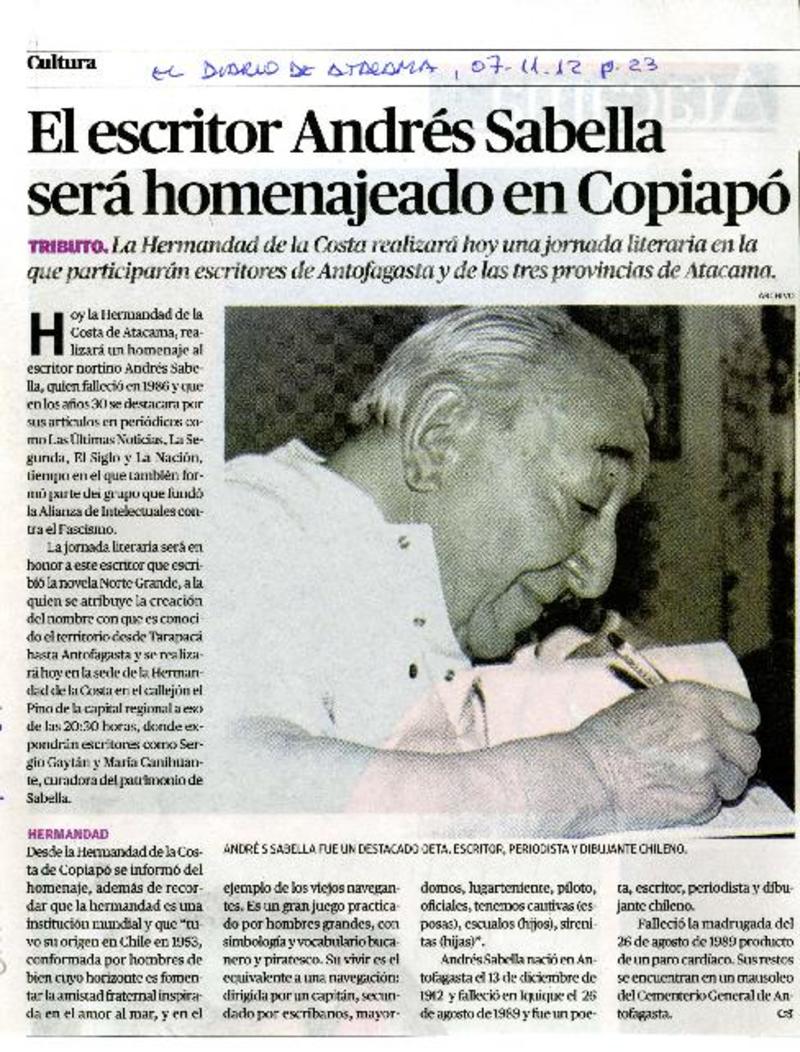 El escritor Andrés Sabella será homenajeado en Copiapó. [artículo]