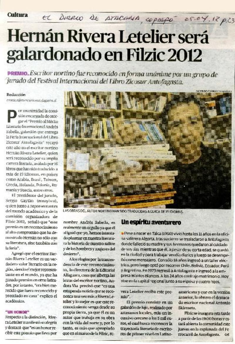 Hernán Rivera Letelier será galardonado en Filzic 2012. [artículo]