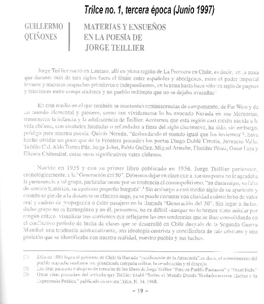 Materias y ensueños en la poesía de Jorge Teillier [artículo] Guillermo Quiñonez.