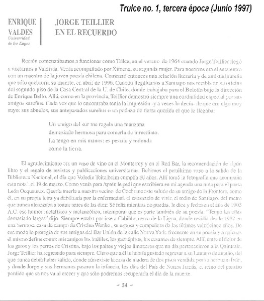 Jorge Teillier en el recuerdo [artículo] Enrique Valdés.