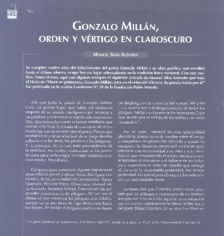 Gonzalo Milláwn, orden y vértigo en claroscuro [artículo] Manuel Silva Acevedo.