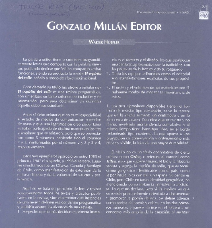 Gonzalo Millán editor [artículo] Walter Hoefler.