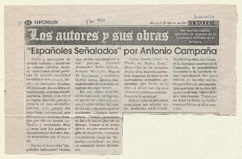 "Españoles señalados" por Anotonio Campaña [artículo] Matías Rafide.