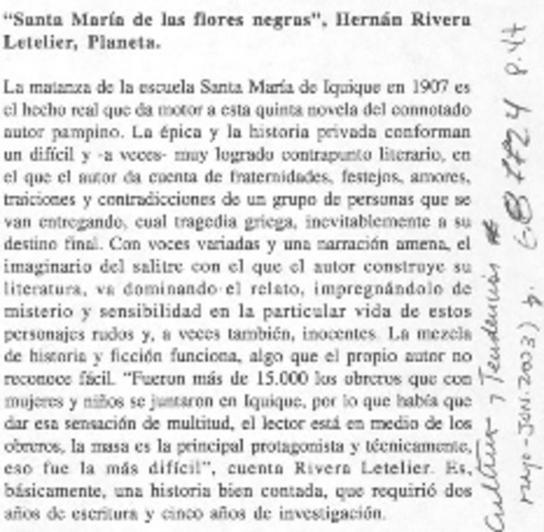 Autores chilenos - Santa María de las flores negras - Rivera Letelier, Hernán