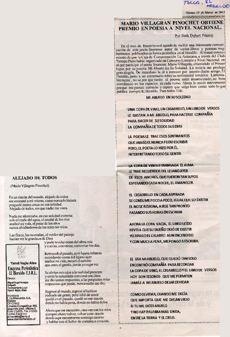 Mario Villagrán Pinochet obtiene premio en poesía a nivel nacional [artículo] Ruth Duhart Pilgrim.