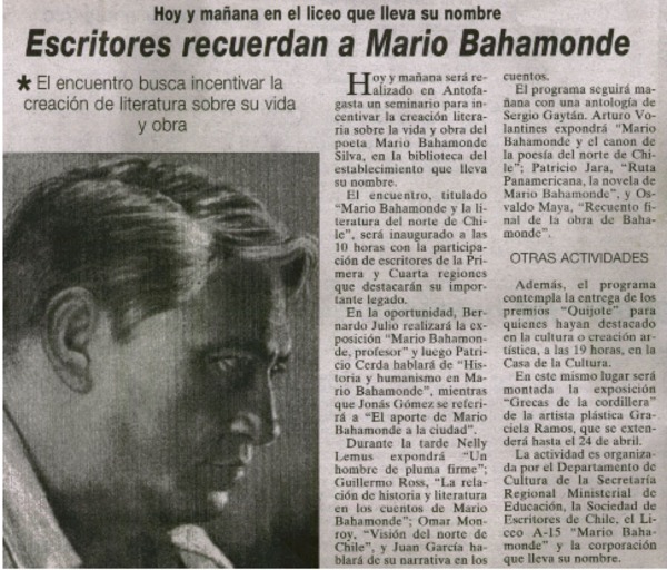 Escritores recuerdan a Mario Bahamonde. [artículo]