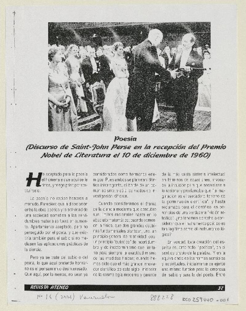 Discurso de Saint-John Perse en la recepción del Premio Nobel de Literatura el 10 de diciembre de 1960 [artículo] Saint-John Perse.