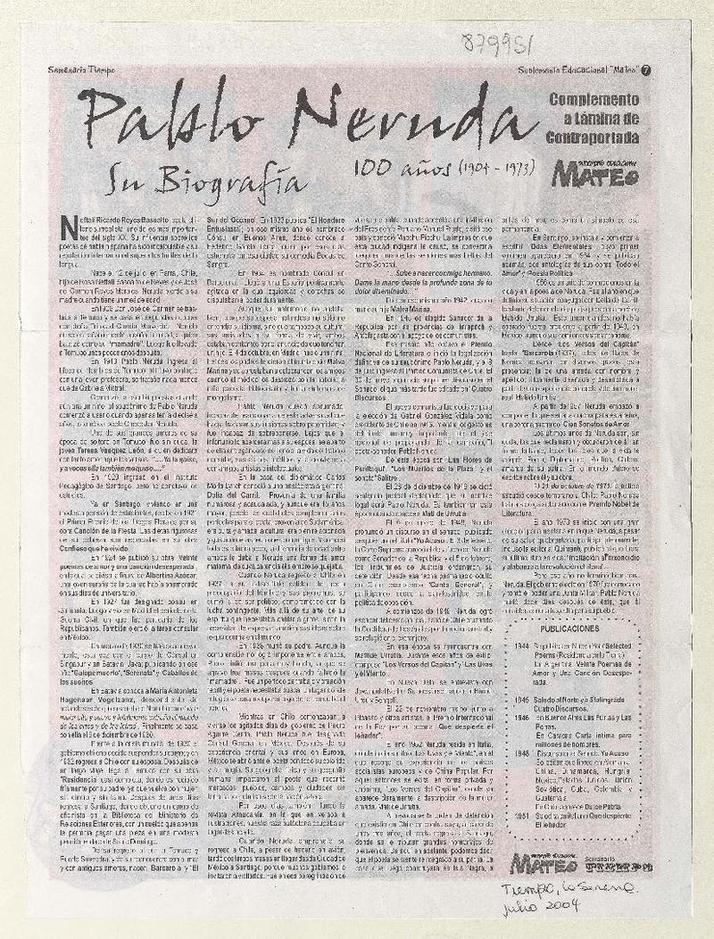 Pablo Neruda su biografía 100 años (1904-1973) [artículo]