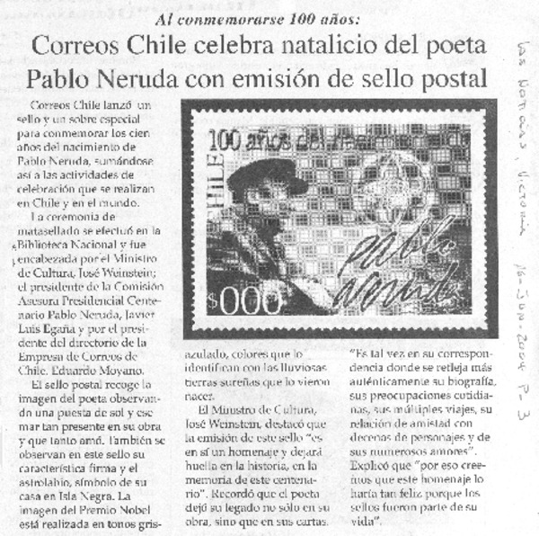 Correos de Chile celebra natalicio del poeta Pablo Neruda con emisión de sello postal [artículo]