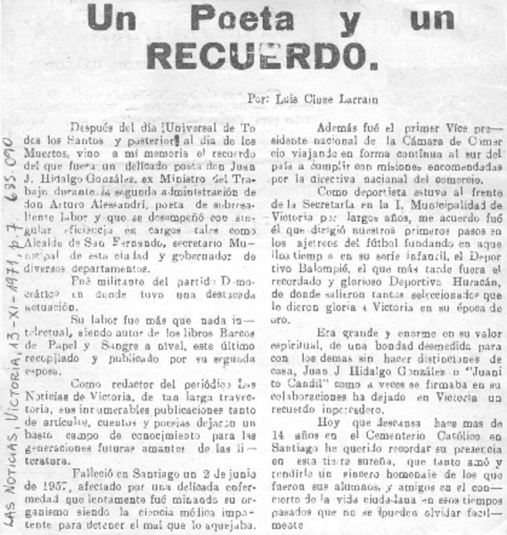 Un poeta y un recuerdo [artículo] Luis Cluze Larraín.