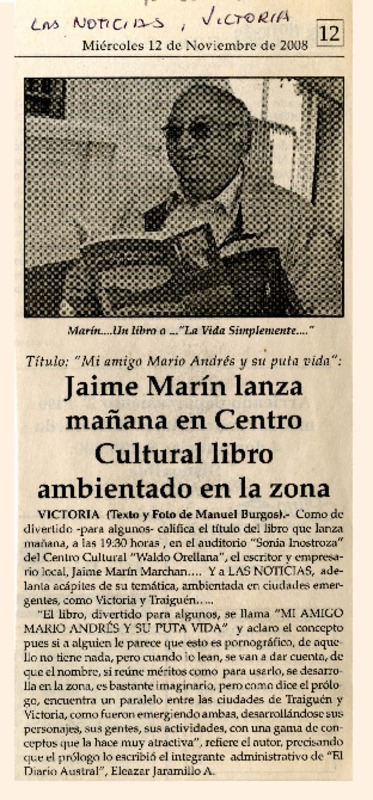Jaime Marín lanza mañana en centro cultural libro ambientado en la zona [artículo] Eleazar Jaramillo A.