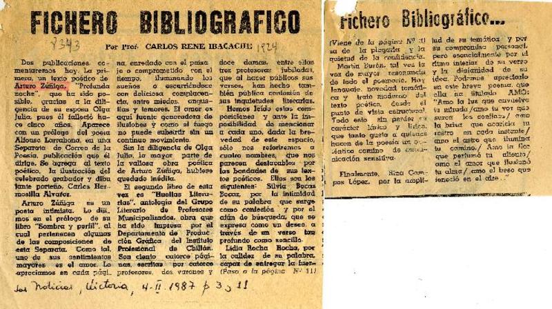 Fichero bibliográfico, Arturo Zúñiga [artículo] Carlos René Ibacache.