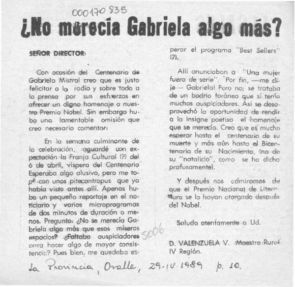No merecía Gabriela algo más? [artículo] D. Valenzuela V.
