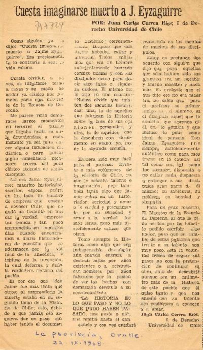 Cuesta imaginarse muerto a J. Eyzaguirre [artículo] Juan Carlos Correa Ríos.